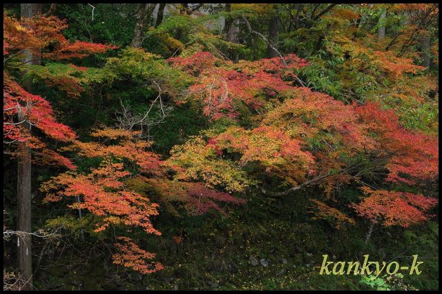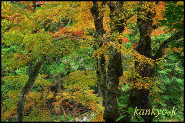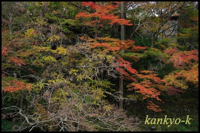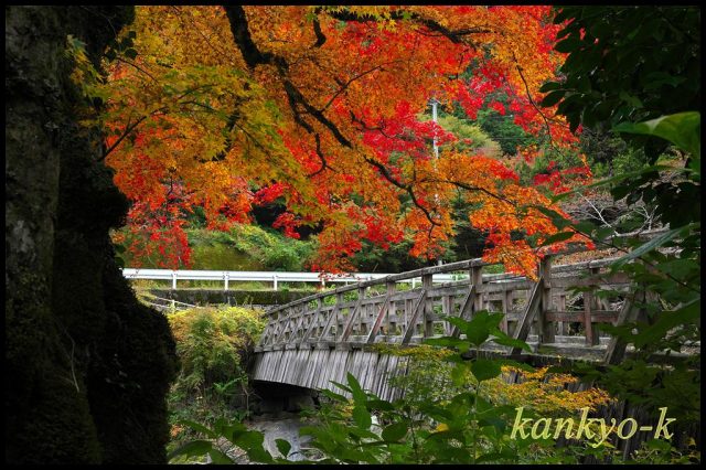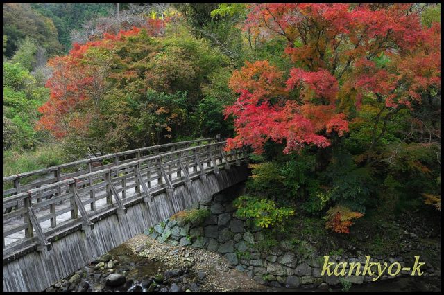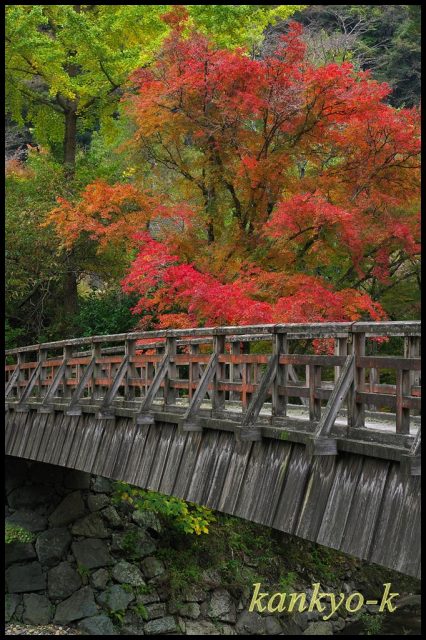 木製の唐橋を渡ったところにあるモミジは一段と綺麗に色付いており