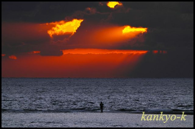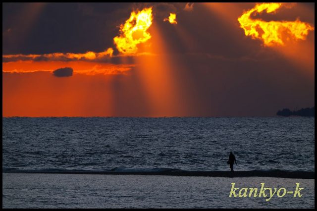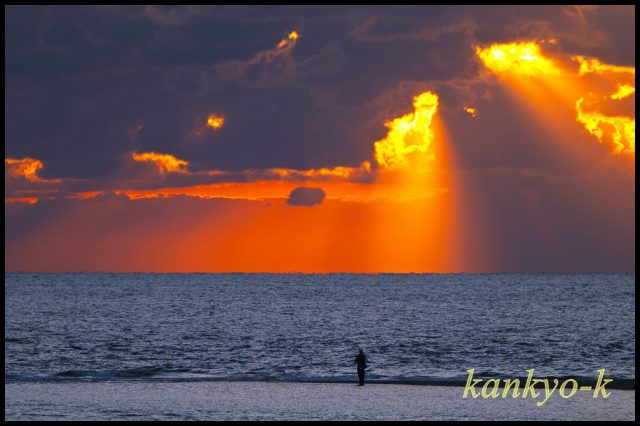 雲の切れ間から夕日の光が海を照らすように差し込んで